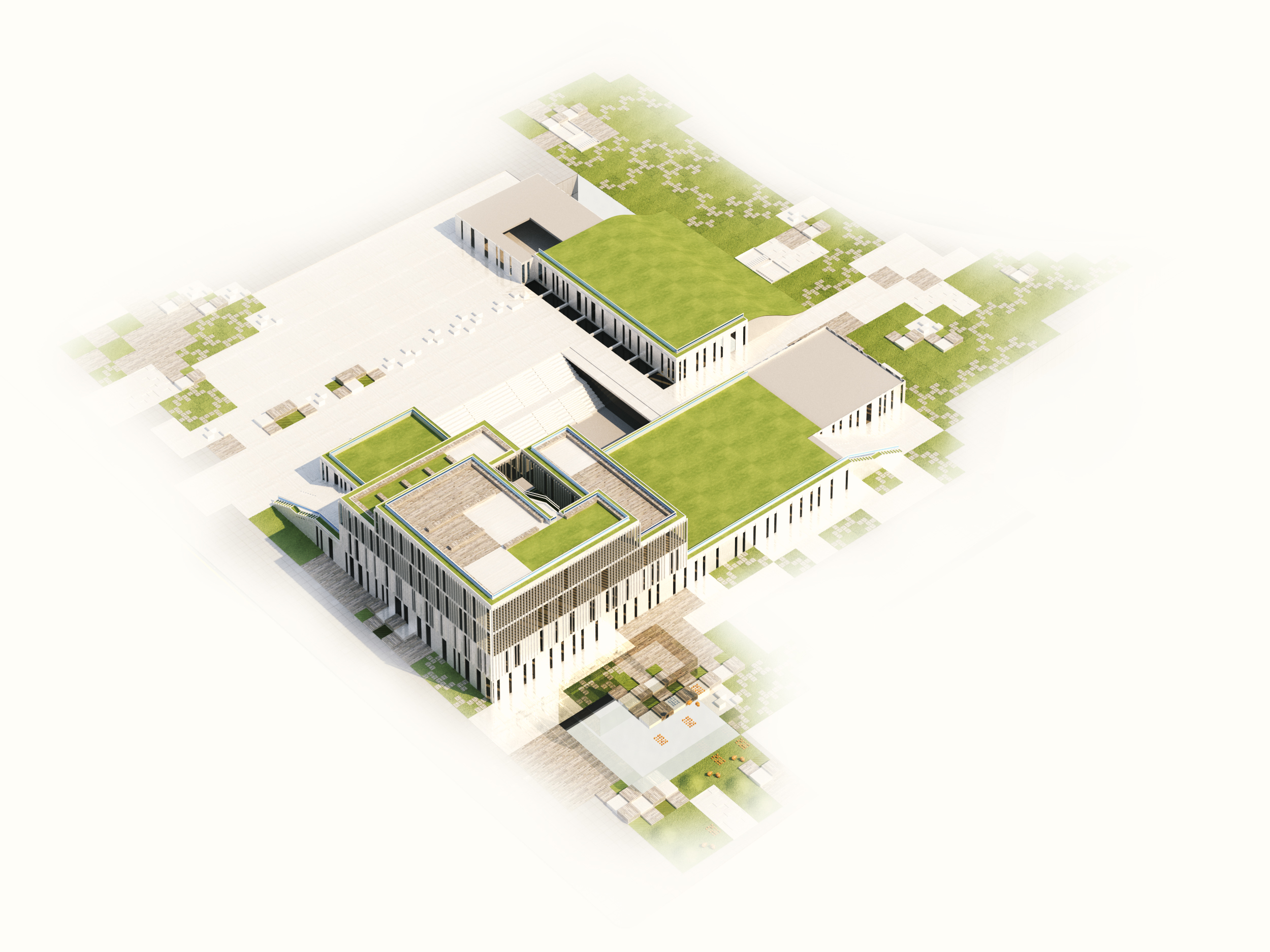 El nuevo parque planteado junto a la propuesta saltara a la cubierta de nuestro edificio en el segundo nivel para formar parte del mismo, de esta manera este podium verde en altura que formará parte del sistema de espacios verdes de la propuesto junto con las cubiertas del último nivel, las terrazas y el parque a nivel de suelo a través del cual se accede a los diferentes edificios de esta propuesta para el nuevo Ministerio.