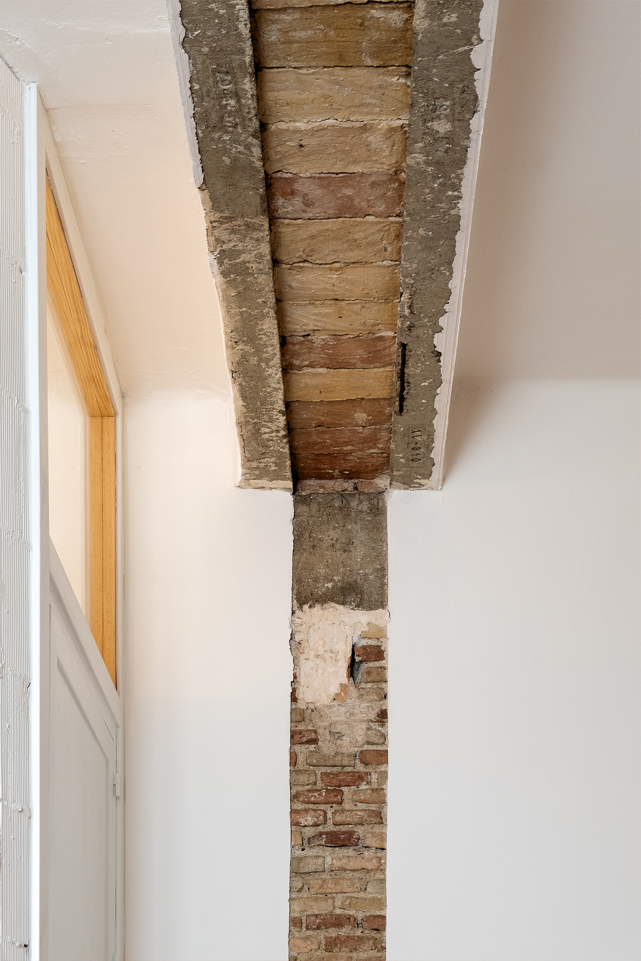 Se conservan las huellas tras las demoliciones tanto en techos como en suelos, se cicatrizan poniendo de relieve la superposición de capas que cuentan la historia y el paso del tiempo; ‘suturar’ grietas existentes y ‘descarnar’ elementos portantes originales como vigas y pilares ayudan a conformar una estética natural.