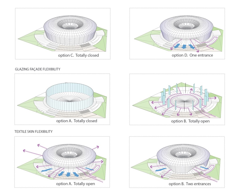 The skin of the facades is designed to have movement, so that the façade can be mechanically changed depending on the type of exhibit or the daylight. This is part of its flexible character.