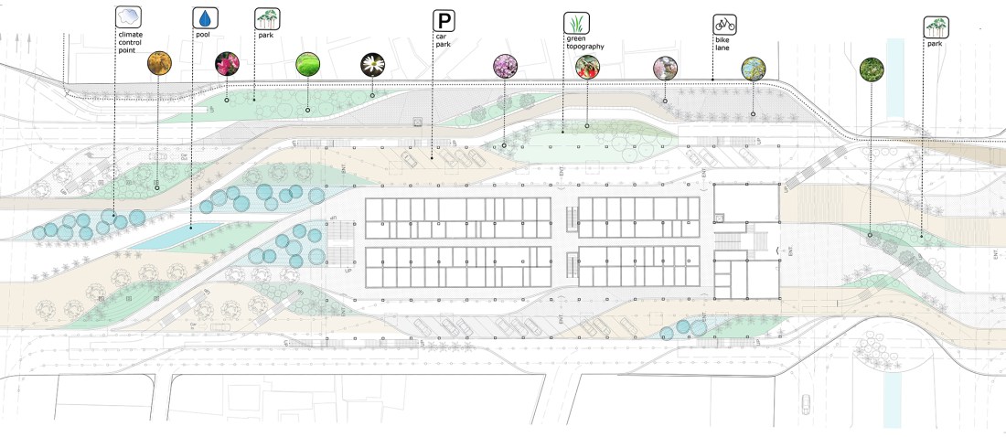 The protagonists of the design will be green parks, trees, flowers, wooden walkways and open-air activities.