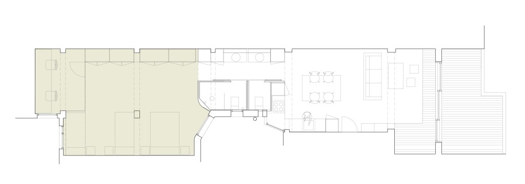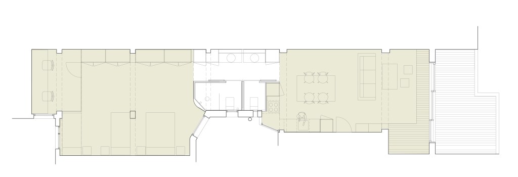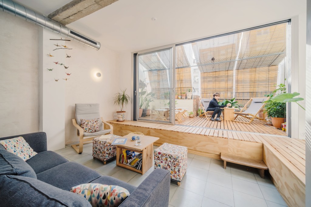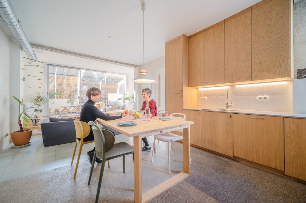 - A sur, la zona de día con el espacio de salón-comedor-cocina. Todo en uno. Esta zona disfruta de un espacio que llamamos ‘colchón climático’ que desdibuja el límite entre el interior de la casa y la terraza como espacio exterior. La terraza ya no es terraza, se convierte en un ‘interior al aire libre’ como las pinturas de espacios domésticos de Ramón Casas, pintor modernista catalán que tan bien plasmó estos espacios vivideros difusos.