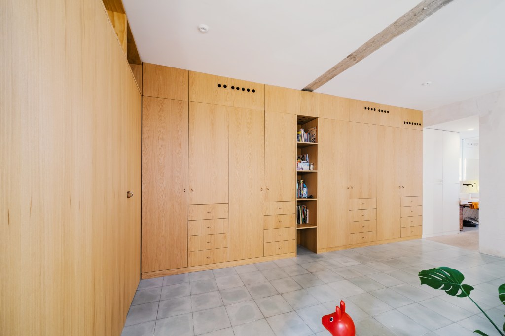 Toda la madera de la casa se piensa como espacio-almacenaje. Cocina, armarios, altillos, incluso la extensión de tarima del suelo de la terraza hacia el salón es un arcón oculto para almacenaje de utensilios de jardinería y juguetero.