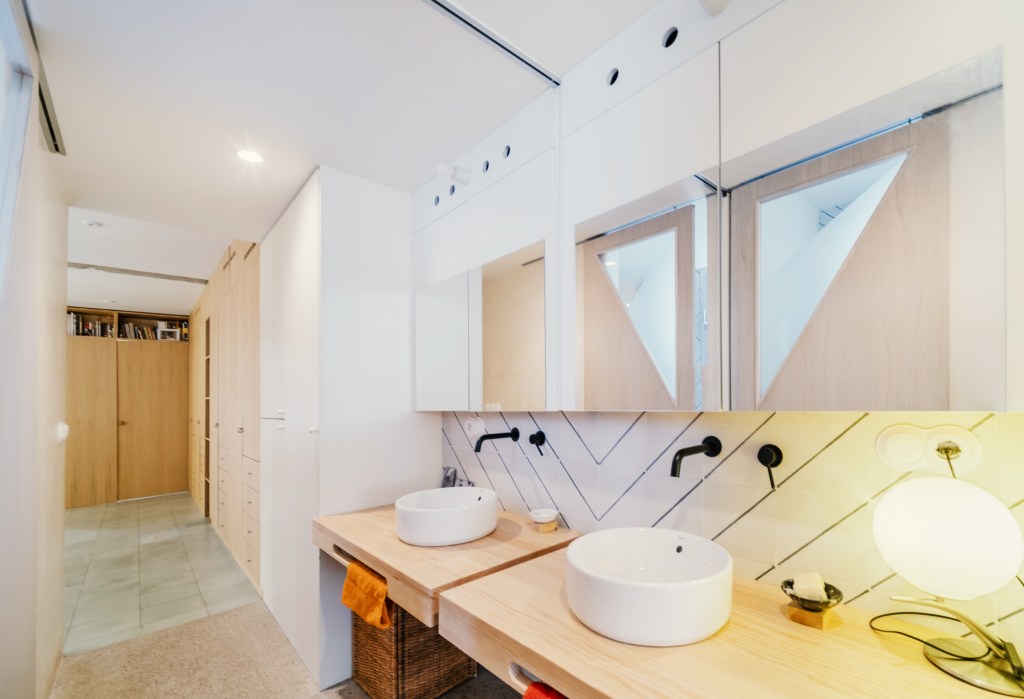 Ambas zonas comparten y a la vez se dividen por un elemento central que alberga los núcleos húmedos. Un aseo para la zona de dia, un baño completo para la zona de noche. Con la particularidad de que los lavamanos salen fuera, con el doble objetivo de eliminar el pasillo como mera zona de paso y para duplicar la simultaneidad de uso de los baños. Para ello, estos lavamanos forman parte del mobiliario de la casa, son bonitos, se enseñan.