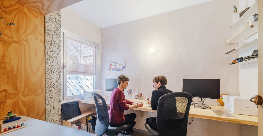 El único espacio cerrado de la casa es la zona de trabajo, materializada en una burbuja de madera, se ideó para ‘trabajar dentro de un armario’.