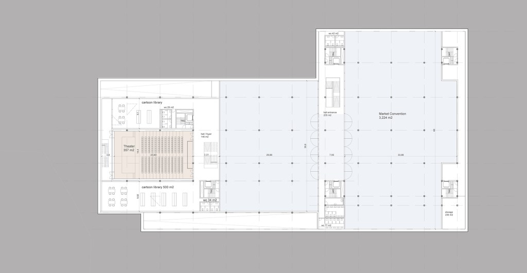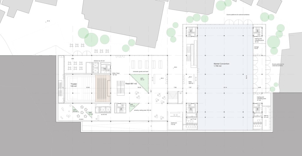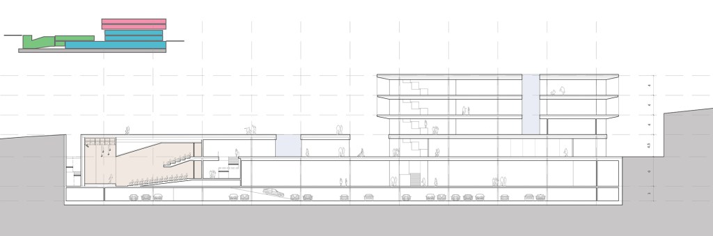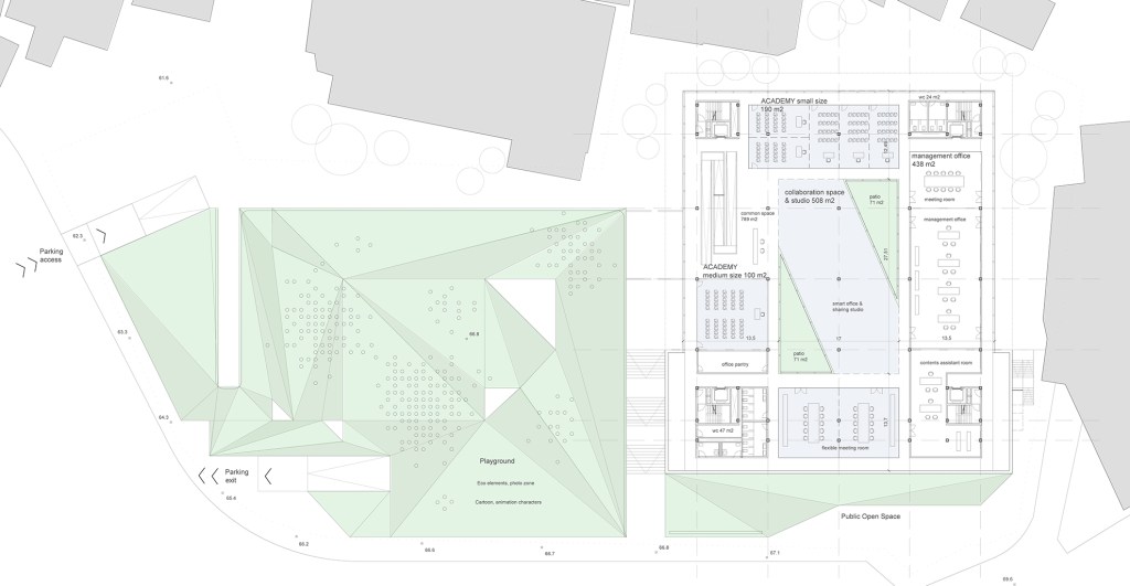 The Playground zone is at the same time a cinema and a big urban park that qualfies the site and gives a green plaza to the citizens.